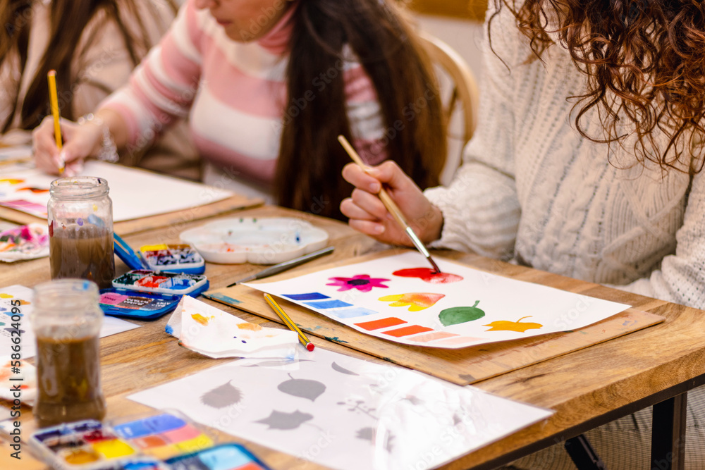 Watercolor Workshop. School Supplies. Friends painting together in the workshop.
