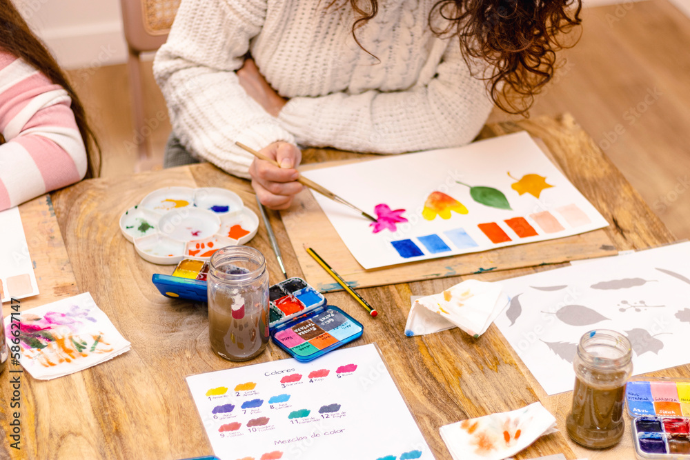 Watercolor Workshop. School Supplies. Woman painting with watercolors.