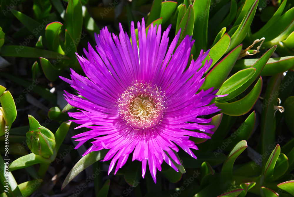 Closeup Fuchsia pink Ice Plant flower with sunlit and shaded leaves. Contrast of beautiful bright pink, gentle yellow and multiple shades of green. Spring/summer succulent bloom in Greek park.