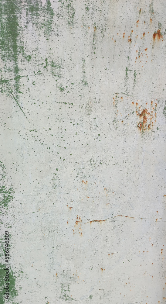 The texture of an iron panel, painted gray-green several times, with spots of rust and paint. Photo, background.