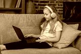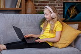 Little girl with headphones and laptop on sofa in room. Child is playing a video game.