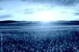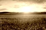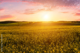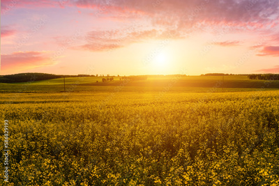 Agricultural flowering rapeseed field at sunset or sunrise.