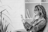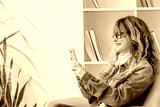 happy mature woman on sofa using mobile phone