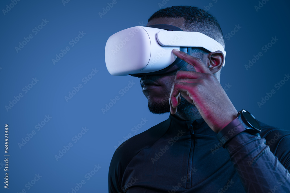 Concentrated young ethnic man touching VR goggles in studio