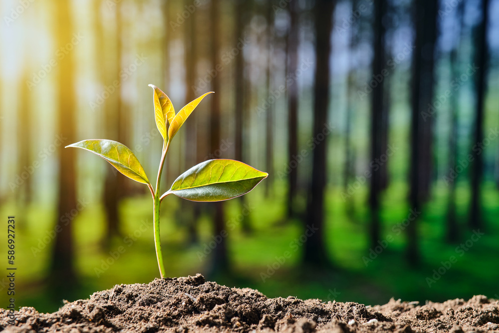 plant growing out of the sunlit soil in a forest with defocused trees in the background