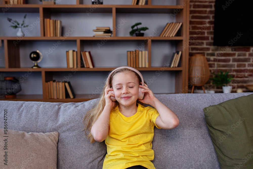 Happy child listens to music or audiobook at home on couch. Little school kid wearing headphones.