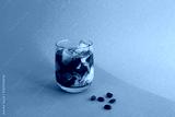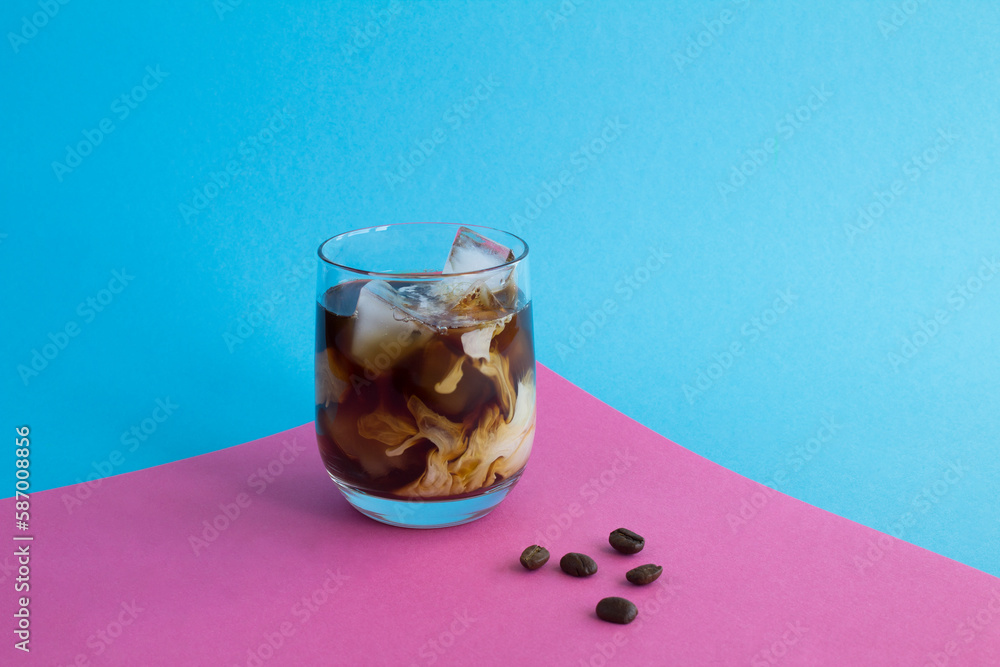 Iced coffee with milk in the drinking glass on the pink and blue background. Copy space.