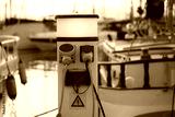 Charging station with electrical outlets for yachts in a harbor. Power socket bollard on pier. Marina theme. Charger cables outdoors. A station for boats in boat station Luxury lifestyle travel voyage