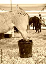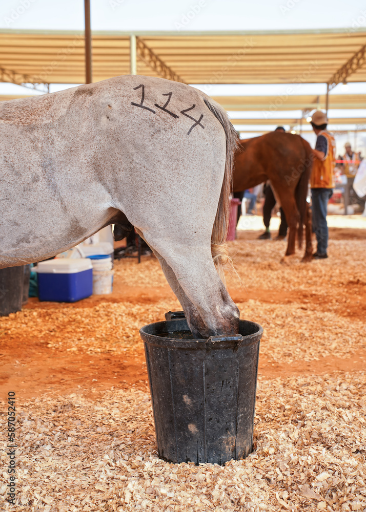 White Arabian horse having rear legs cooled in bucket with water, at break after completing loop during endurance race in provisional stables