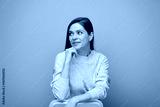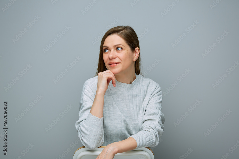 Portrait of woman sitting on chair, leaning on her arm and looking away.