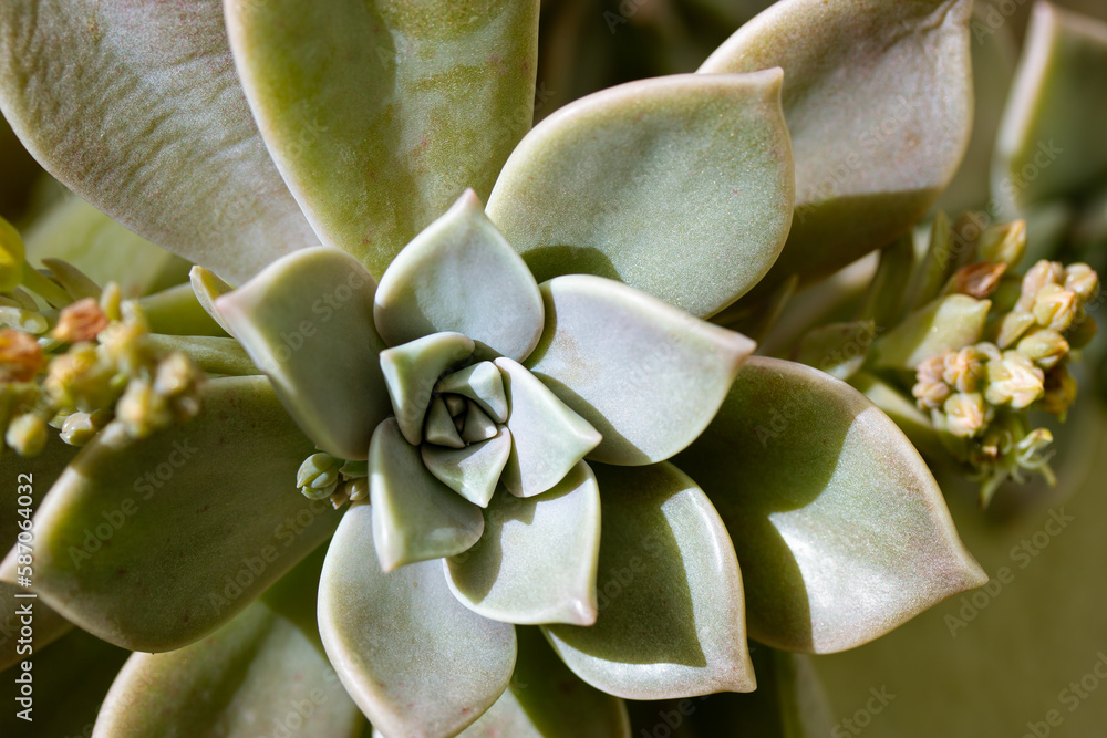 Green blue succulents cactus rosette leaves close up, exotic garden plants natural wallpaper. Graptopetalum paraguayense succulent Ghost plant in summer day Floriculture, horticulture. Floral business
