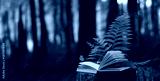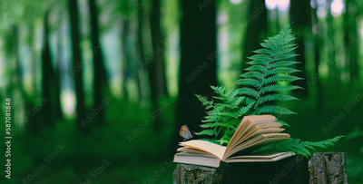 butterfly, fern leaves and old open book on stump in forest, dark natural blurred background. mystery atmosphere. leisure reading , pure wild nature, environment concept. template for design. banner.