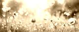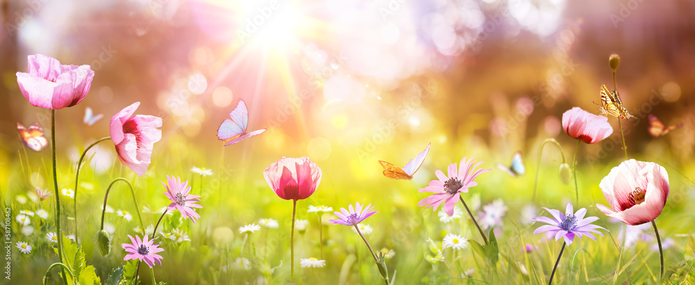 Spring - Sunny Field With Poppies And Daisies Flowers On Grass With Abstract Defocused Landscape