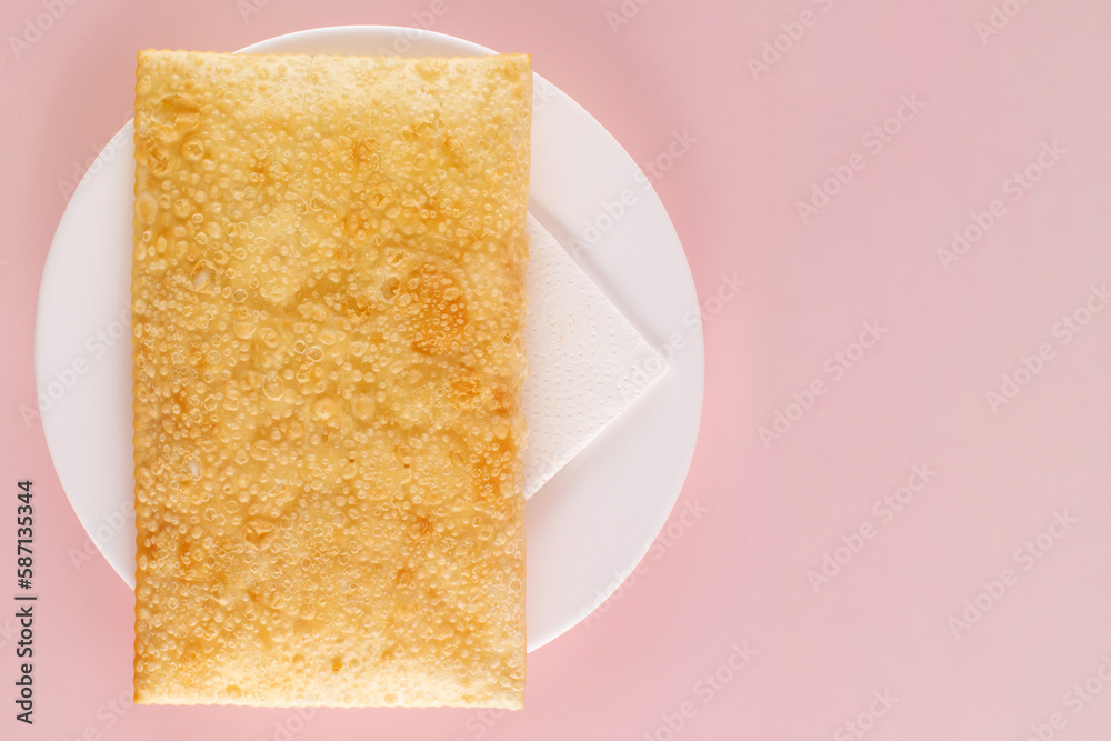 Isolated Fried Pastry on Plate, Brazilian Street Food Pastel, Top View, Copy Space