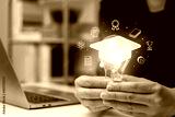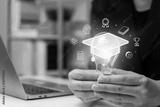 Elearning graduate certificate program concept, businessman hand holding light bulb with Internet education course degree, study knowledge, creative thinking idea, problem solving solution, AI.