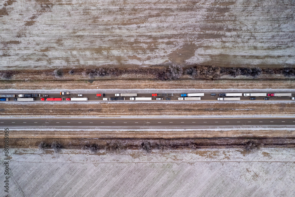 Aerial view of highway in Oklahoma after snow storm with traffic. Trucks and cars are going on interstate along fields.