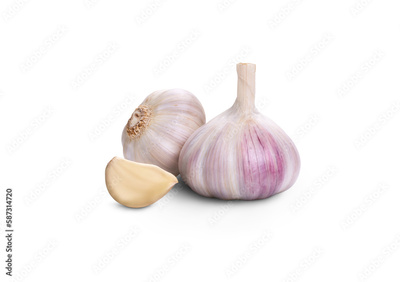 A whole fresh garlic head and clove segment isolated against a transparent background.