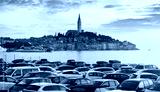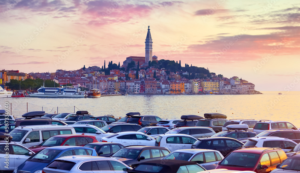 Rovinj Croatia. Sunrise sky above vintage town at Istria peninsula in Adriatic Sea. View from cars parking. Old Mediterranean architecture and buildings. Coastline tower of Church Saint Euphemia