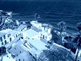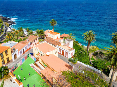 Aerial View at San Andres village near Los Sauces at northeast of La Palma Island. Green Volcanic Hills, and the Coast of the Atlantic Ocean. Canary Islands, Spain.