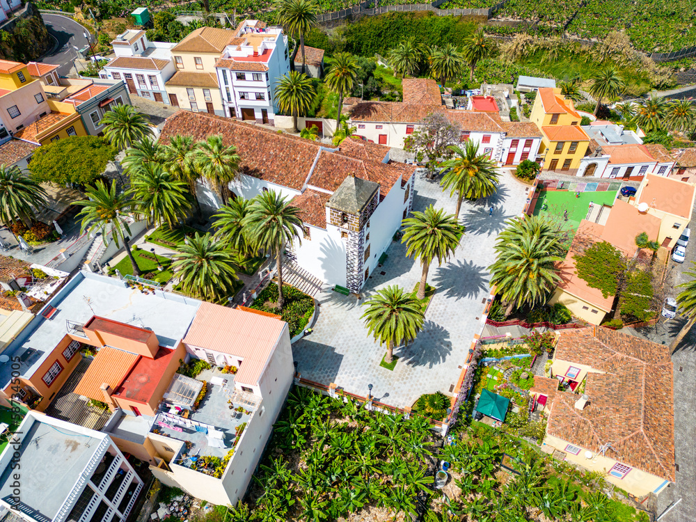 Aerial View at San Andres village near Los Sauces at northeast of La Palma Island. Green Volcanic Hills, and the Coast of the Atlantic Ocean. Canary Islands, Spain.