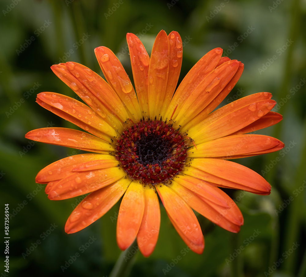 Gerbera Garvinea Sweet Sunset in Bloom with rain droplets.