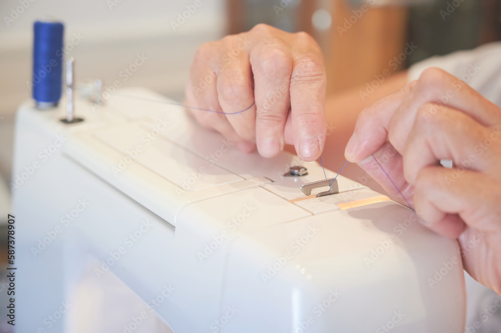 Hands of an unrecognizable woman threads the thread on a sewing machine. Elaboration of handmade clothes in a sewing workshop.