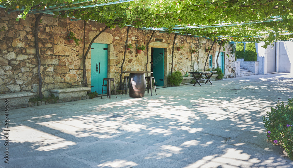 Entrance of a winery where the wine produced with the type of Albariño grape from its vineyards is stored. Rias Baixas. Organic winegrowing.