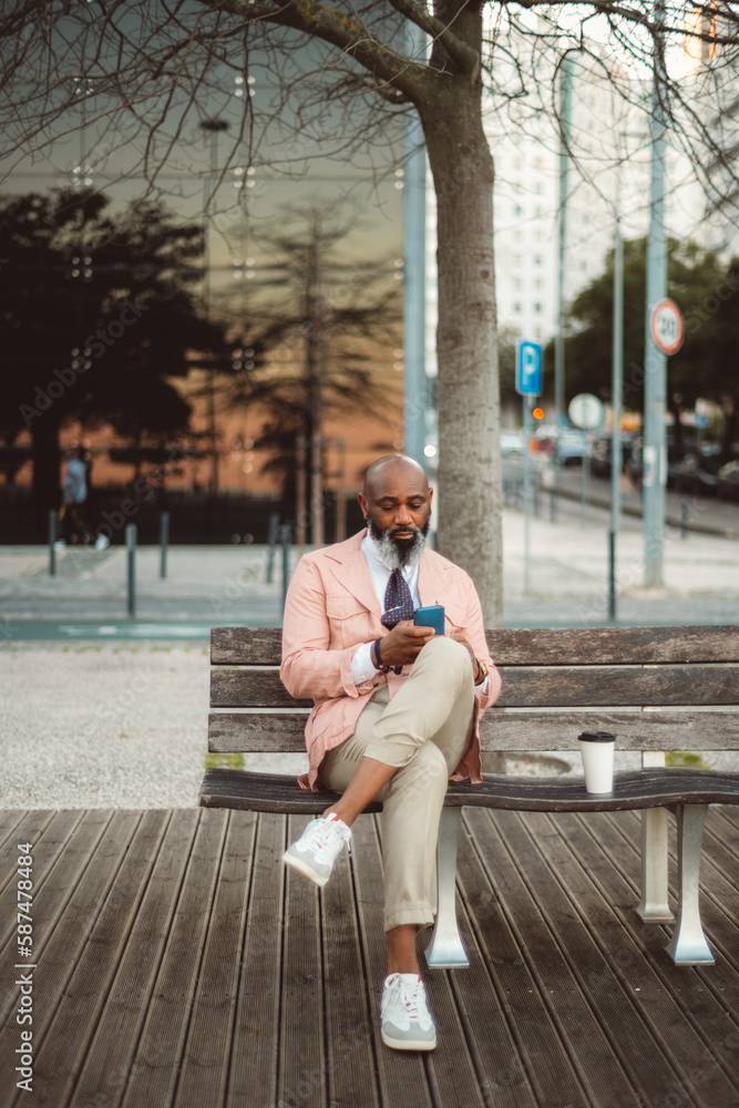 A vertical shot of a well-dressed bald black man seated on a wooden bench with a coffee cup next to him. His peachy jacket and cream trousers show his ankles while he checks his phone