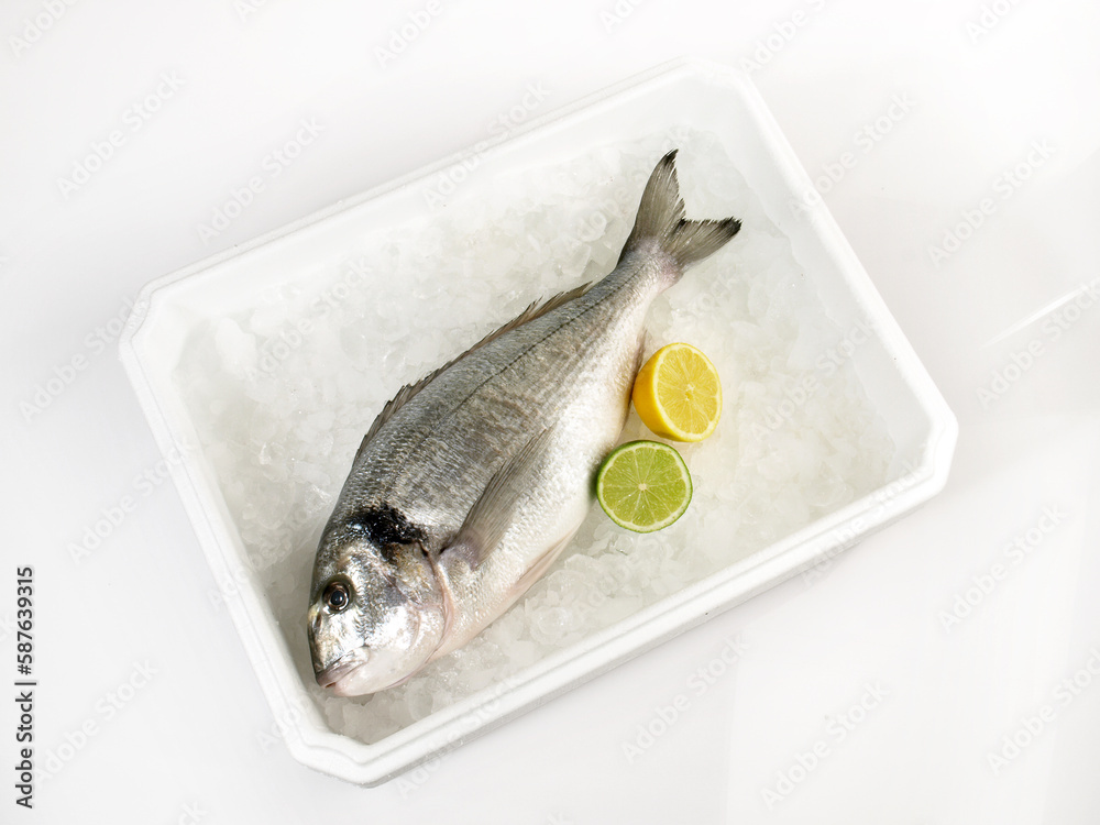 Transportation Box with Ice and Fish isolated on white Background - Grey Gilthead Seabream