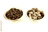 dry and wet dog food in bowls, canned food and dry feed for pets and cats isolated on white background