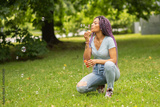 african american woman outdoor,a girl with colored hair in the summer in the park blows soap bubbles in nature,happiness and joy