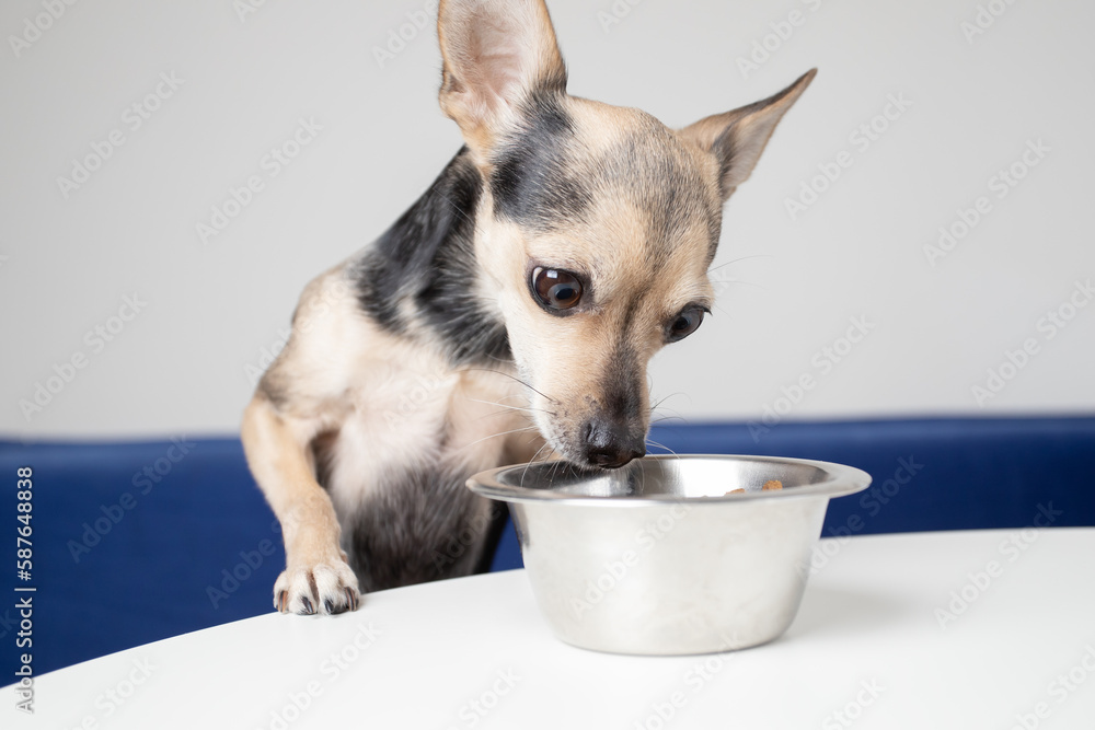 a small funny dog sniffs dry feed, pulls his muzzle to a bowl of food