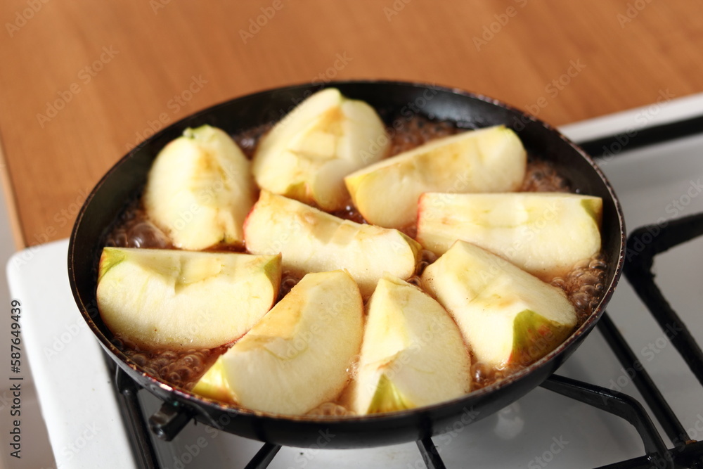 Cooking apple quarters on gas oven. Making Apple Tarte Tatin with Cinnamon Series.