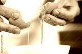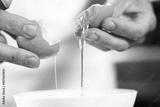 Separating egg yolk from white. Making mayonnaise with a wooden spoon.