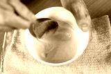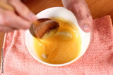 Mixing yolks with sugar and salt. Making mayonnaise with a wooden spoon.