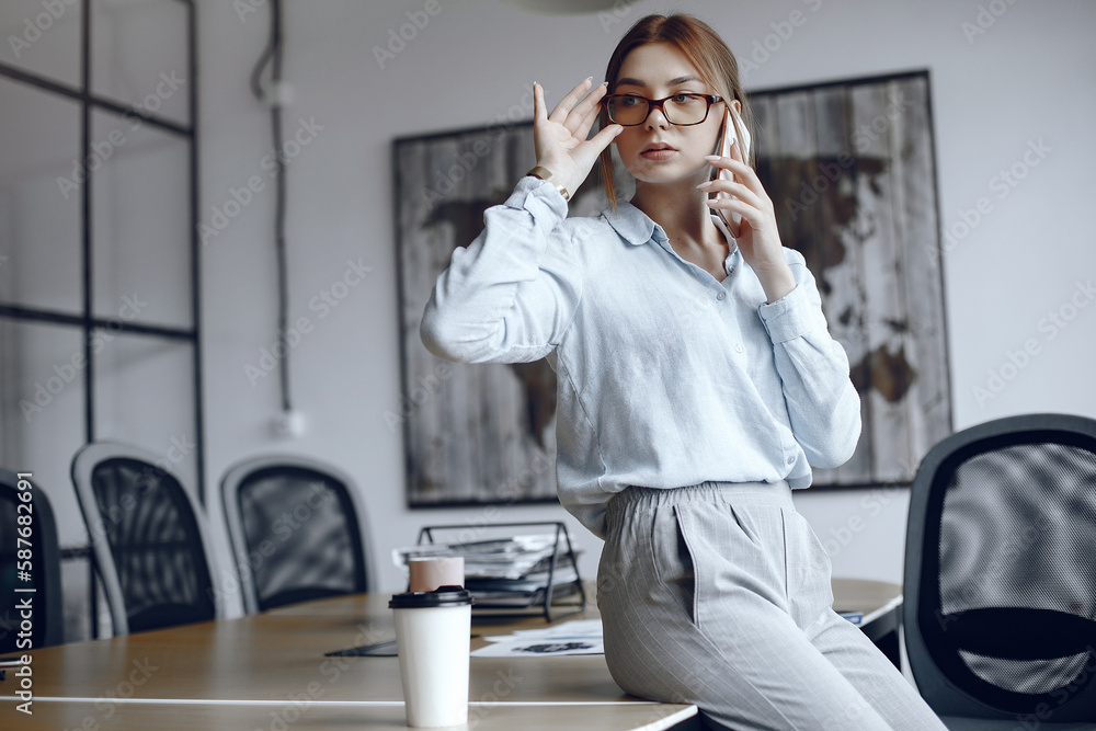 Woman talking on the phone and adjusting glasses