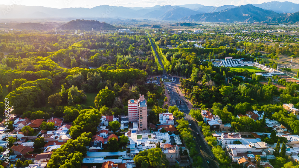Mendoza Argentina Aerial Drone Fly Above City Center, Green Urban Landscape of Famous Andean Cordillera Vineyard Town