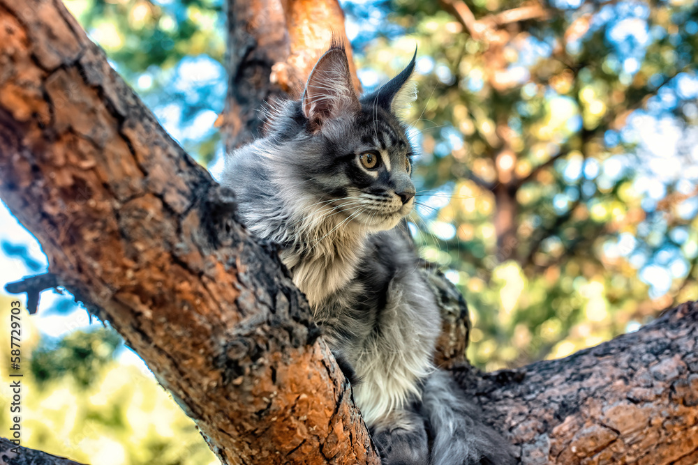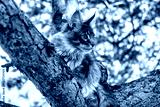 A very bright blue Maine Coon cat sitting on a tree...