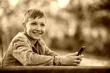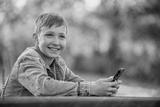 Smiling child holds mobile phone in a garden, on a sunny summer day. Happy teen boy playing on a cell phone outdoors. Young cheerful teen typing on mobile phone sitting behind a table in a park.