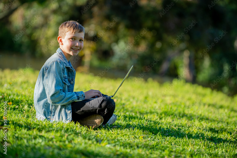 Smiling schoolboy with a laptop sits on a green lawn. Young cheerful school child sitting and typing on computer in the park. Teen Boy studying online with a computer, outdoors. Looking at the camera.