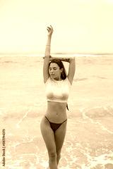 A beautiful young woman in a white cropped t-shirt stands on the background of the ocean.