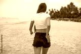 Woman in a white cropped t-shirt walking along a beautiful beach.