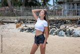 Attractive woman in a white cropped t-shirt on the beach. Mock-up.