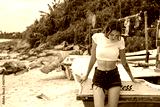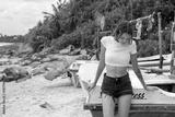 Attractive woman in a white cropped t-shirt stands near the boat on the beach.