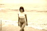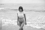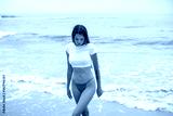 Beautiful young woman in a white cropped t-shirt comes out of the ocean.