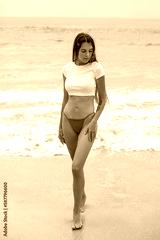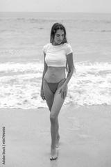 Beautiful young woman in a white cropped t-shirt comes out of the ocean.