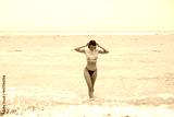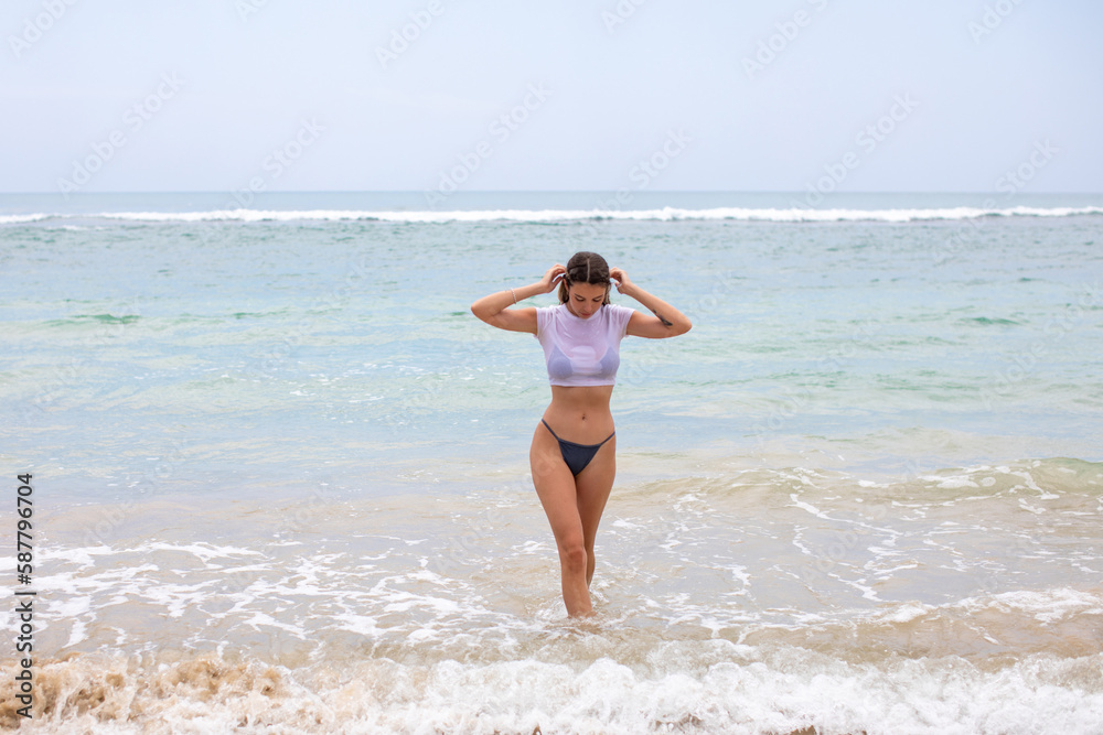Beautiful young woman in a white cropped t-shirt comes out of the ocean.