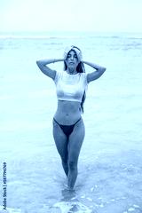 Beautiful young woman in a white cropped t-shirt comes out of the ocean.