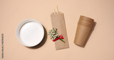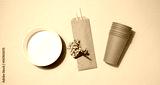 Empty paper plate for soup and brown cardboard cups on beige background, top view