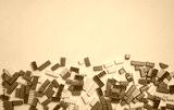 Multi-colored plastic cubes of a children's designer on a blue background, top view
